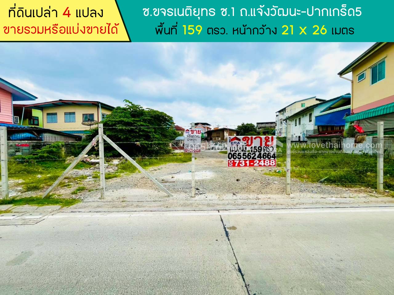 ขายที่ดินซอยขจรเนติยุทธ ซ.1 ถนนแจ้งวัฒนะ-ปากเกร็ด5 พื้นที่ 159 ตรว. ขายรวมหรือแบ่งขายได้ เพียง 38,000 บาท/ตรว. จากปากซอยแจ้งวัฒนะ-ปากเกร็ด เพียง 350 เมตร ใกล้ตลาดเทศบาลปากเกร็ด